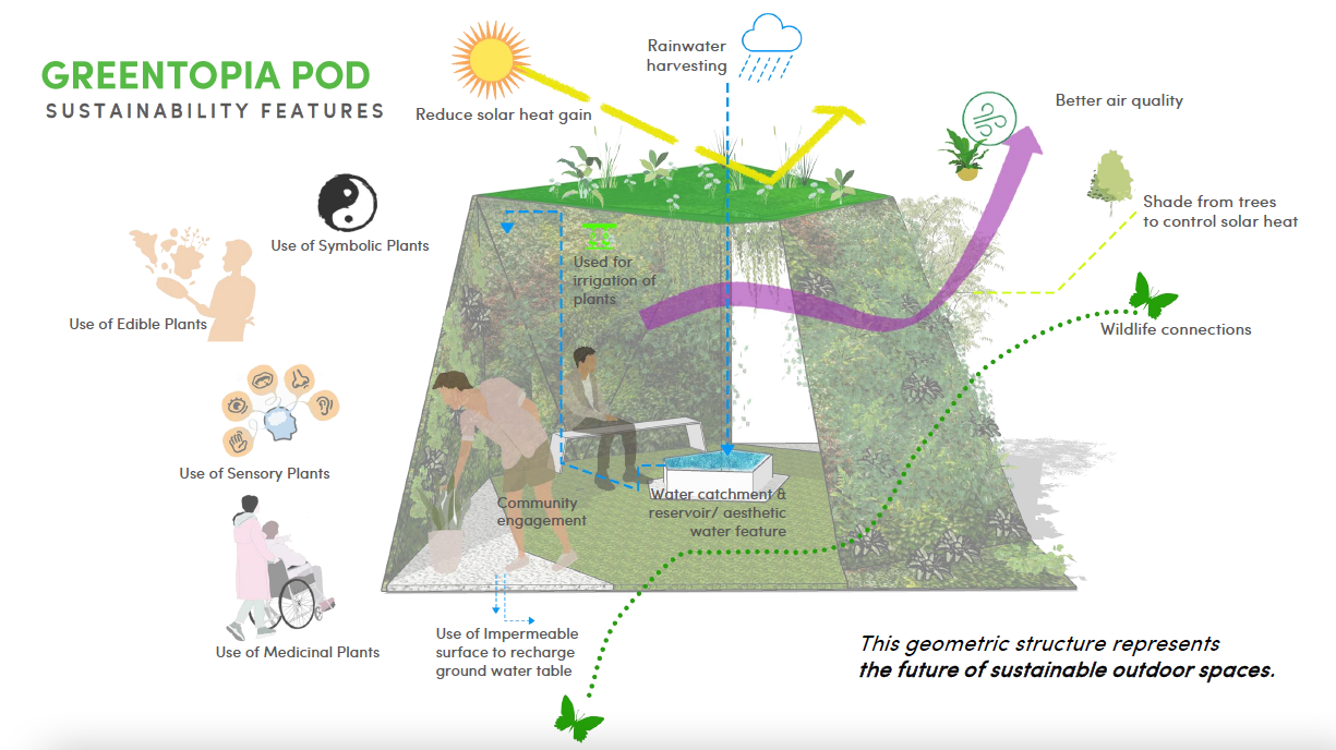 With a plot of 6m x 6m and a theme of “Into the Next Dimension” we have formulated the concept of Greentopia Pods, utilizing vertical greenery to showcase Climate, Ecological and Social Resilience as we navigate through the future of sustainable living.